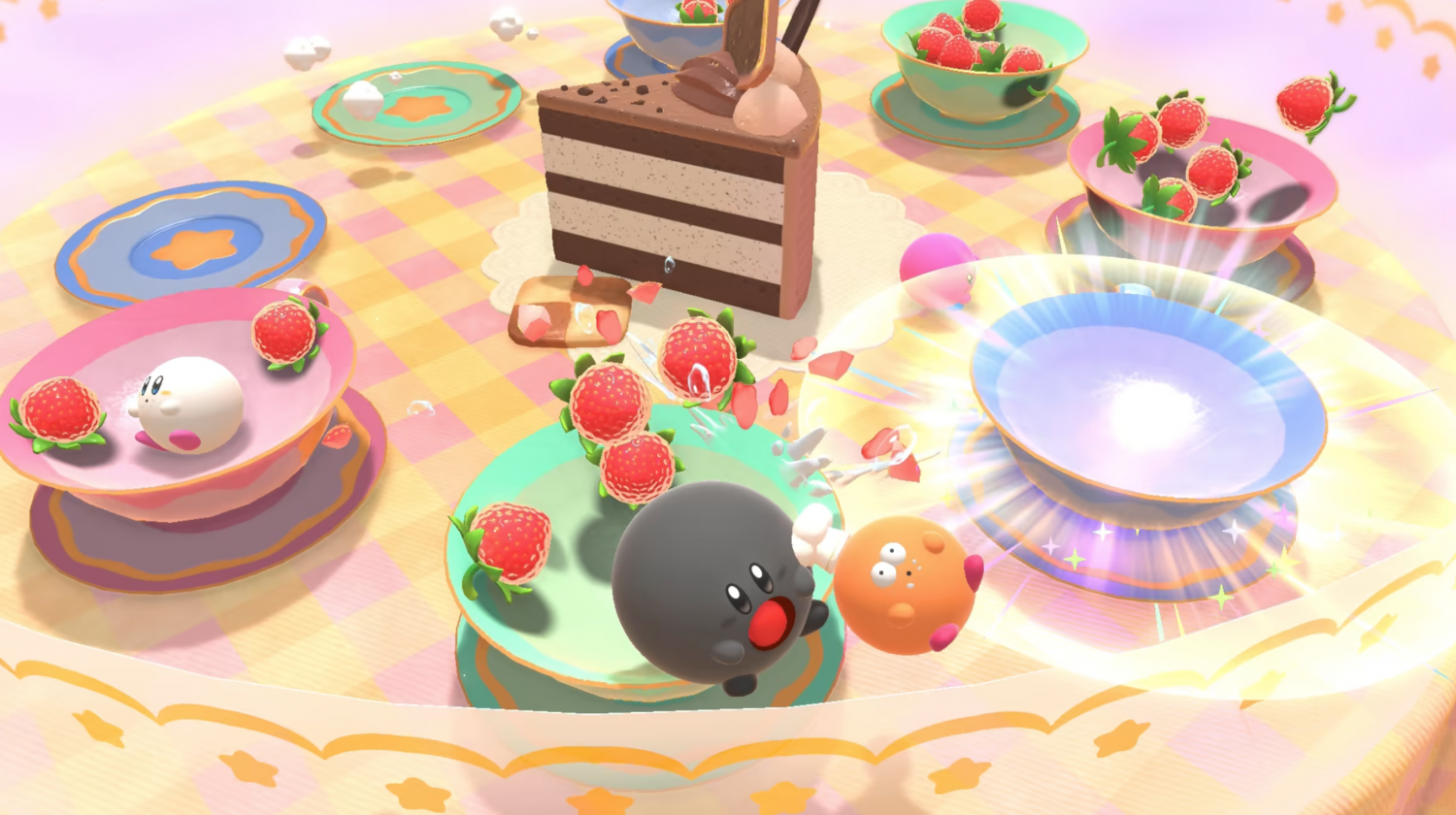 My son couldn’t stop jumping up and down over getting Kirby Dream Buffet. He loves Kirby games, but for some reason was particularly excited about this one, and just played by himself when he needed to decompress after long days of studying. So what’s it about? Well, bigger-and-rounder-than-ever Kirby can bump, battle, and boost his way to sweet victory, along with family and friends (up to four players) in one of the four modes of play: