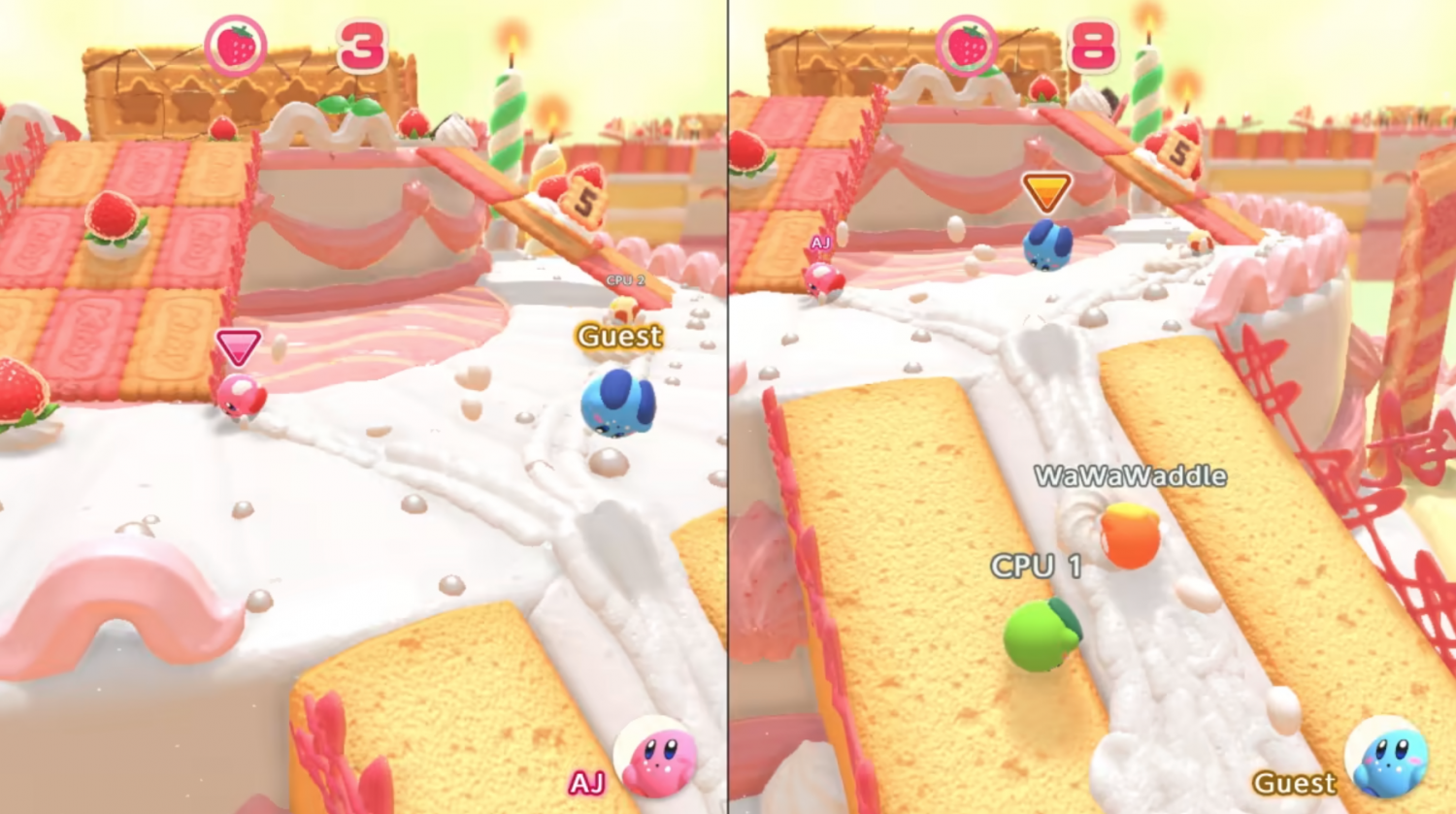 4 Battle Royale- in the final confrontation, knock opponents off the stage and become the biggest Kirby as you eat the goodies!